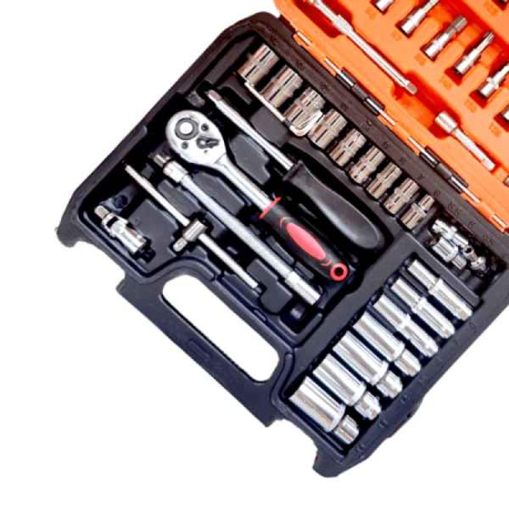 - المحتويات: تشمل مجموعة متنوعة من السوكتات، رؤوس البراغي، مفاتيح الألين، أدوات التمديد، مقبض راشيت، وحقيبة حمل عملية.